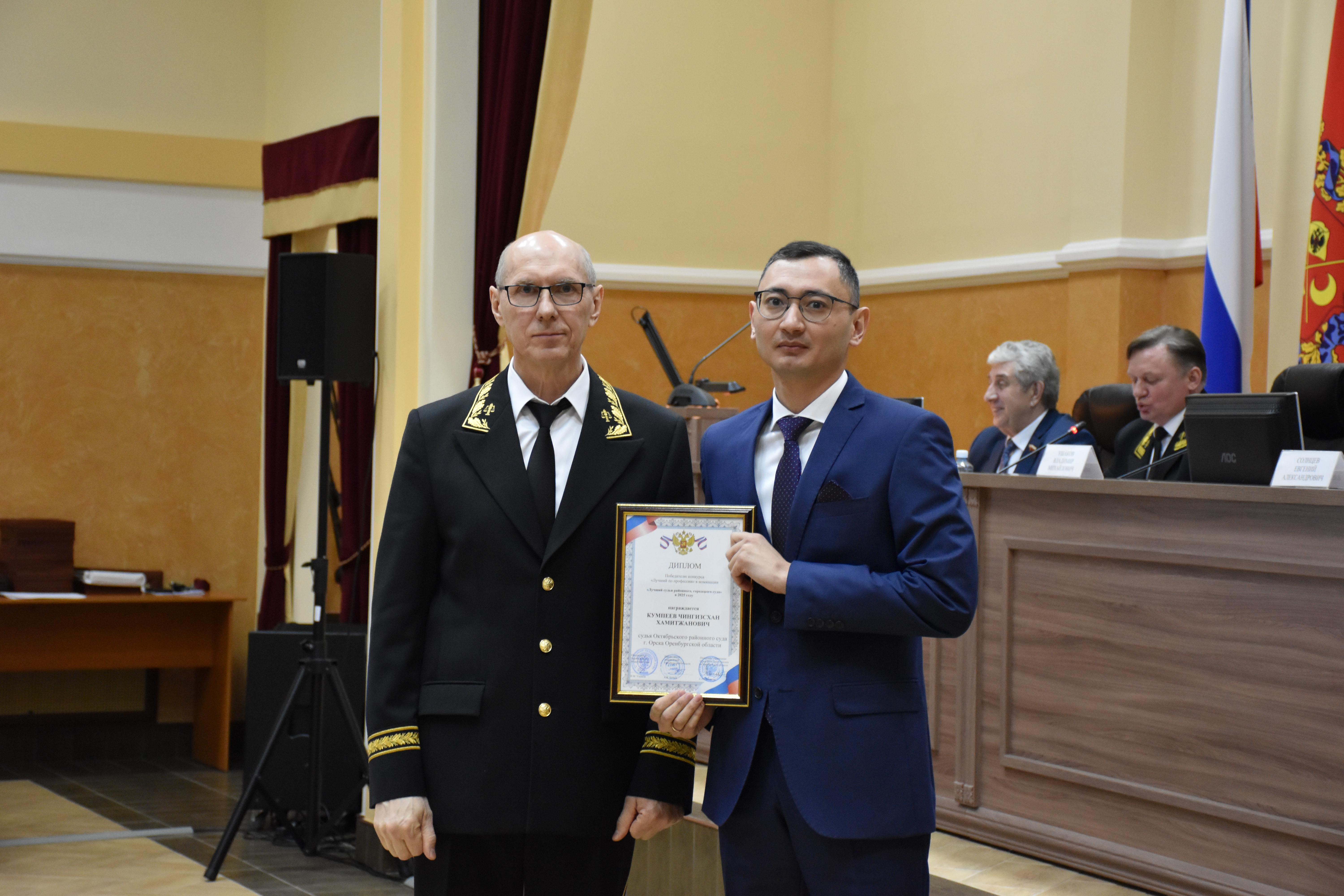 «Лучший судья районного, городского суда» – Кумпеев Чингизсхан Хамитжанович – судья Октябрьского районного суда г. Орска Оренбургской области, – Пичугина Олеся Петровна – судья Бугурусланского районного суда Оренбургской области;